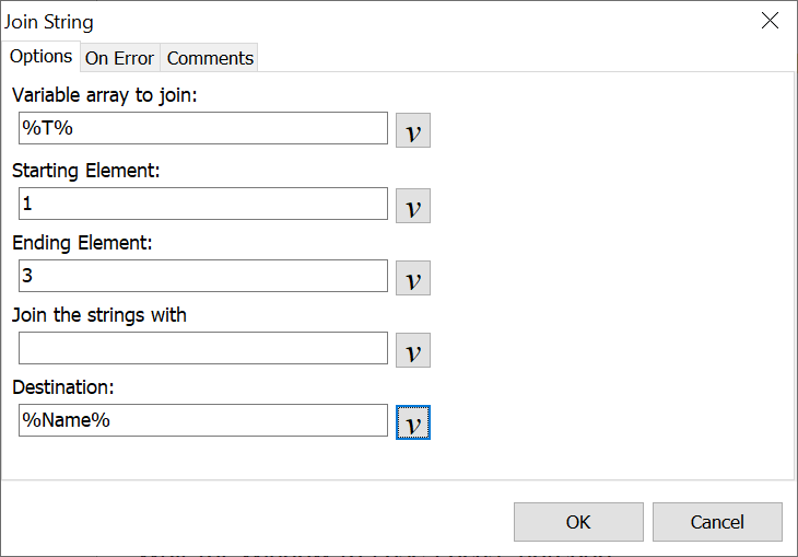 So in our example, John is saved to T[1], Michael is saved to T[2] and Smith is saved to T[3]. The Join String command then saves John Michael Smith to variable %Name%.