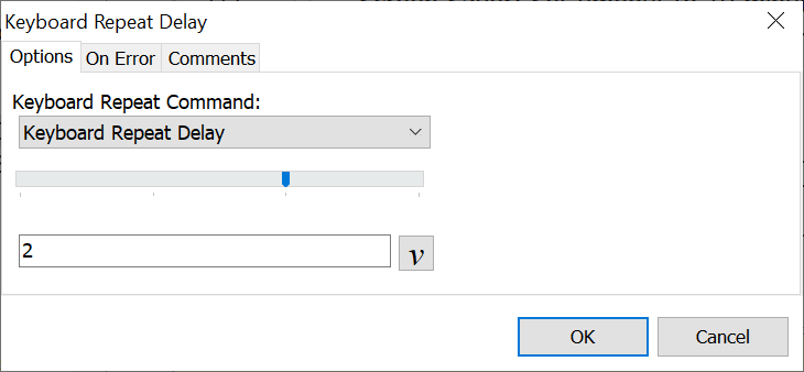 The Set Keyboard Repeat Delay changes the amount of time it takes before holding a key down on the keyboard to start repeating the key. Valid values are 0 through 3 with 0 being the shortest delay. This is the same as selecting "Repeat Delay" under the speed tab when selecting "Keyboard" in the Control Panel. Insert a value from 0 to 3 or adjust the slider bar to the desired setting.