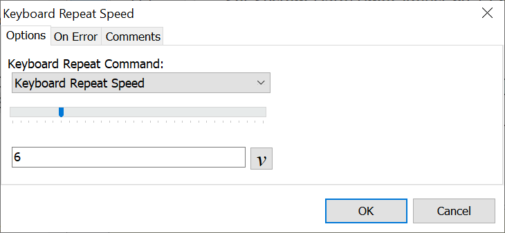 This option changes the speed of keys being repeated when it is being held down on the keyboard. Valid values are 0 through 31 with 0 being the slowest speed. This is the same as selecting the "Repeat Rate" under the speed tab when selecting "Keyboard" in the Control Panel. Insert a value from 0 to 31 or adjust the slider bar to the desired setting.