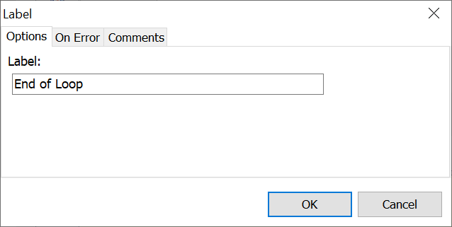 The Label command is used in conjunction with the Go to command. It is used as a marker to be placed in the script. The Go to command moves to the line in the script where the Label is located and continues playing the macro from that point forward. The macro can either jump ahead in the script or return to a previous line in the script.