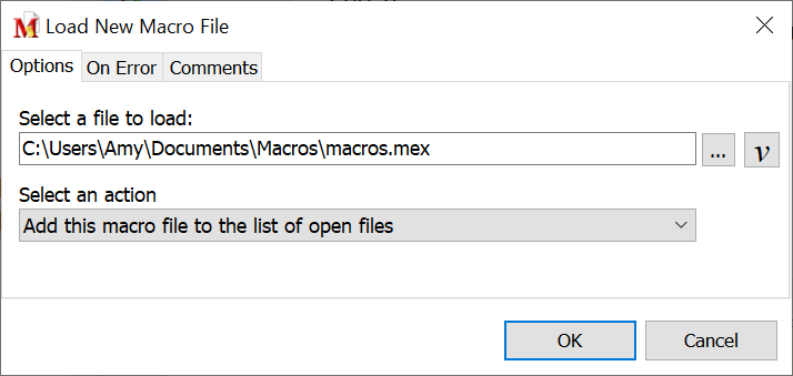 The Load New Macro File command loads a new macro file. You may choose to add the macro file to the list of open macro files or to close all other macro files before opening the new one.