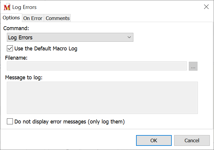This command logs any errors that occur during the execution of a macro to a text file. When this command is encountered, an entry is immediately made in the error log file to indicate that a macro has started. Place this macro command as the first step in the macro script to ensure that the entry is made when the macro runs.