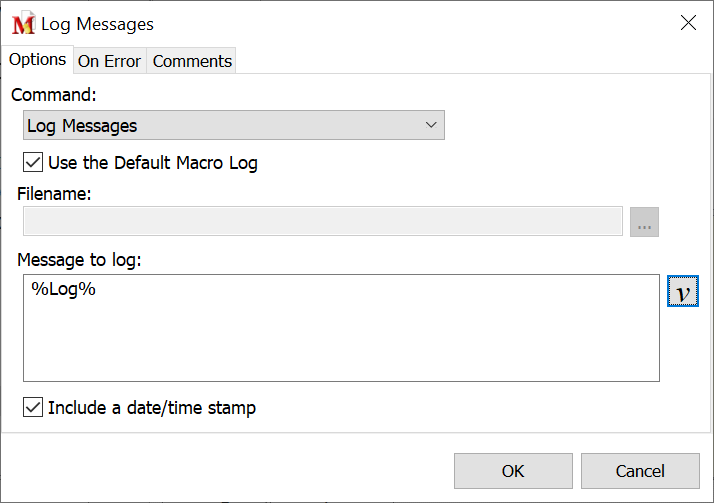 Select this option to have the messages sent to the default file log. The default log file can be set from Options > Preferences > File System - File Paths tab.