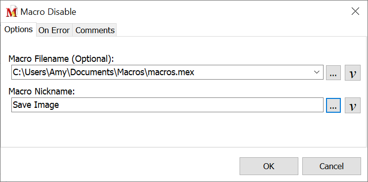 Since Macro Express allows more than a single macro file to be open at one time, click on the Browse button and locate the file that contains the macro to be disabled. Or manually type in the file and path.