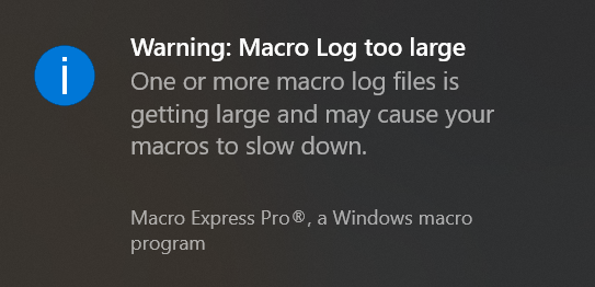 The macro log files can become quite large over time and potentially cause performance issues. This function will warn you if one of the log files is getting too large. A message appears on startup of Macro Express stating that one or more log files may be getting too large.