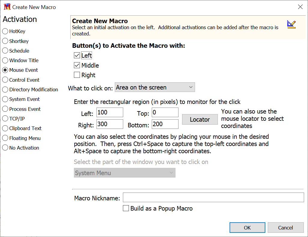 Use this option to define regions on a window that can be assigned as a mouse activated macro. Clicking on this area of the window triggers the macro. This option requires the input of four pixel coordinates - Left, Top, Right, and Bottom. Click on the area within these four pixel coordinates to start the macro.