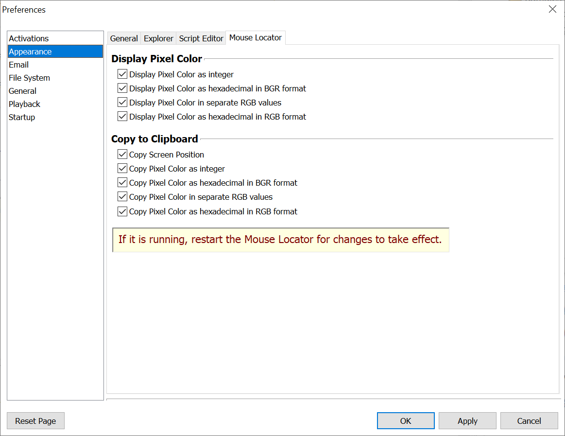 The Display Pixel Color options allow you to choose which Pixel Color values to display on the Mouse Locator.