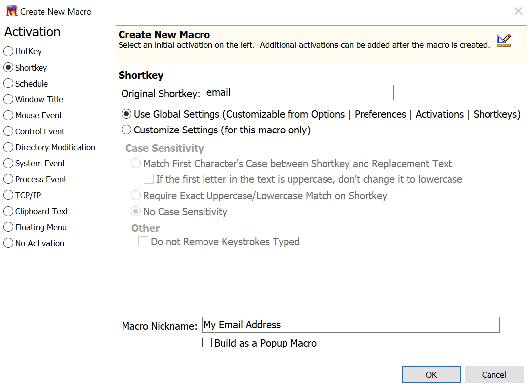 Select the Shortkey option and type in the shortkey (up to a 32 letter code) to use to activate the macro. A shortkey is a set of characters such as abc, myname, etc. See the program specifications for a complete list of characters accepted as shortkeys.