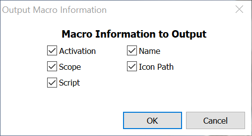 Use this option to select what information from the macro file to save to a text file. As shown in the window below, select which items to output and click OK. A standard dialog box prompts for a file name and folder destination for storing the data.