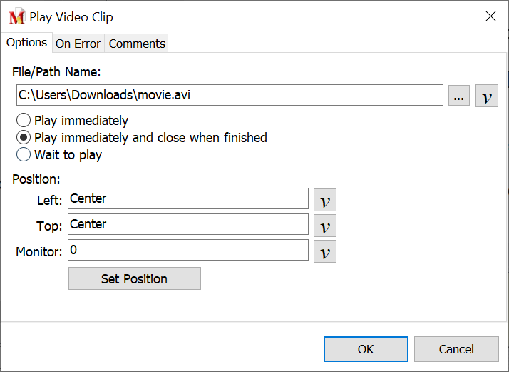 Click on the browse button to find the video file to play back in the macro. After finding the file, click on the Open button to insert the file into the File/Path Name box. Or manually type the file path and name into this field.