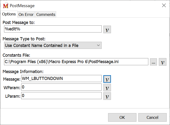 An example would be the WM_LBUTTONDOWN message in the PostMessage.ini file. In the file, the following line appears: