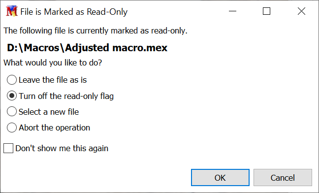 Select this option to have the program prompt for action when a read only .mex macro file is encountered. The following dialog opens allowing the user to select a course of action.