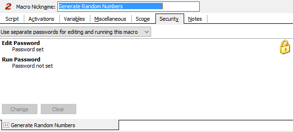 Use this option to password protect a macro before it can be edited, played back or both. From the Macro Explorer, click on the Edit Macro icon to open the Script Editor. Or double click on a defined macro in the list of macros to open the Script Editor. Then click on the Security tab to edit the security settings. Three security options are available.