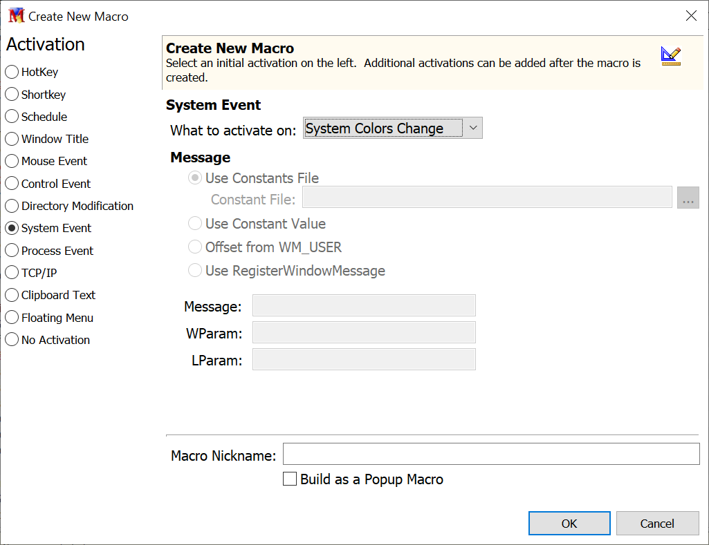 The System Event activation looks for changes to the system. The macro starts when the specified system change occurs.