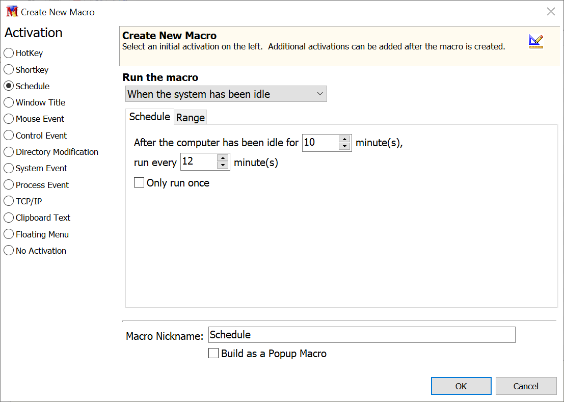 Example In the image above, the scheduler waits for the system to be idle for 10 minutes. The macro waits 12 minutes before running the macro.
