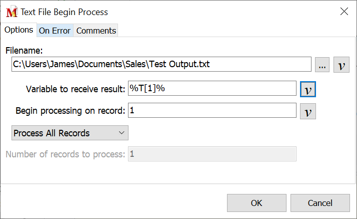Use this option to select which record to begin processing in the file. To process the entire file, enter 1 in the value field to indicate starting with the first record. Or use an Integer variable when specifying which record to start processing and the number of records to process.