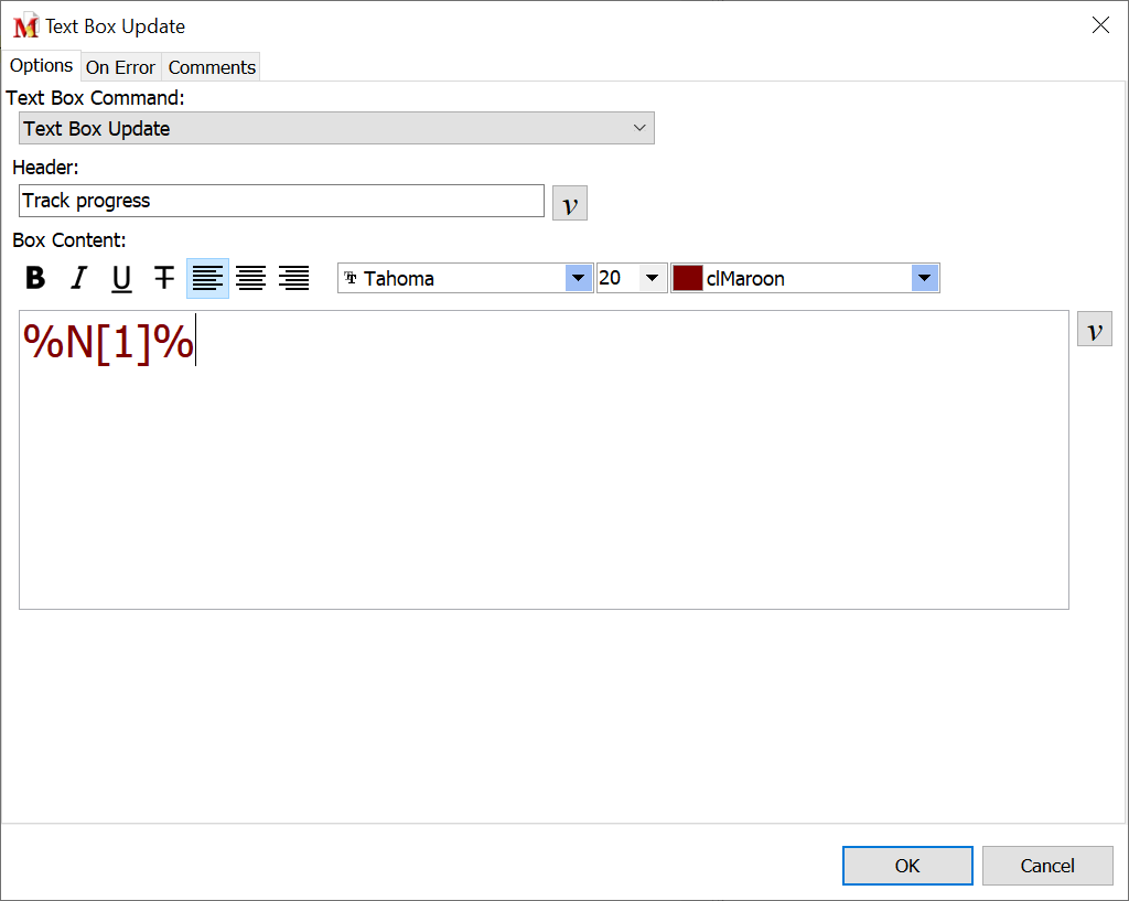 Insert the name of the Text Box to be updated during the playback of the macro. The Header name must match exactly with the header of the Text Box previously defined in the macro script.