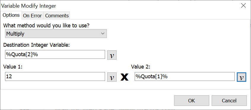 Insert either an integer value or an integer variable into these fields. The values are multiplied and saved to the variable selected.