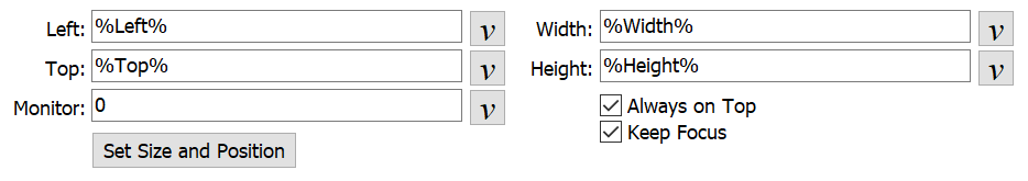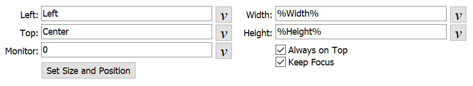 Variable Set Decimal %DisplaySizeMulitplier% to Display Size Multiplier Variable Set Integer %Left% to 50 Variable Set Integer %Top% to 10 Variable Set Integer %Width% to 300 Variable Set Integer %Height% to 250 // Left Coordinate Variable Modify Decimal: %lft% = %Left% * %DisplaySizeMulitplier% Variable Modify Decimal: Round %lft% to 0 decimal places Variable Modify Decimal %lft%: Truncate to Integer (%Left%) // Top Coordinate Variable Modify Decimal: %tp% = %Top% * %DisplaySizeMulitplier% Variable Modify Decimal: Round %tp% to 0 decimal places Variable Modify Decimal %tp%: Truncate to Integer (%Top%) // Width Variable Modify Decimal: %wid% = %Width% * %DisplaySizeMulitplier% Variable Modify Decimal: Round %wid% to 0 decimal places Variable Modify Decimal %wid%: Truncate to Integer (%Width%) // Height Variable Modify Decimal: %hgt% = %Height% * %DisplaySizeMulitplier% Variable Modify Decimal: Round %hgt% to 0 decimal places Variable Modify Decimal %hgt%: Truncate to Integer (%Height%)