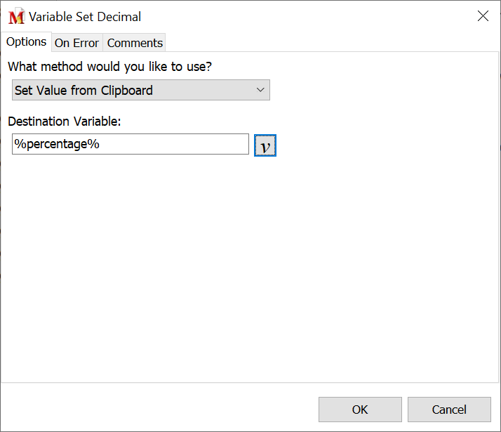 Set Value from Clipboard examines the text contents of the clipboard. It takes this value and strips off any spaces, carriage returns or line feeds. It then attempts to convert the contents to a decimal value and place it in the variable. If a non-decimal value (i.e. a string of text) is in the clipboard or the text clipboard is empty, the variable value is set to zero.