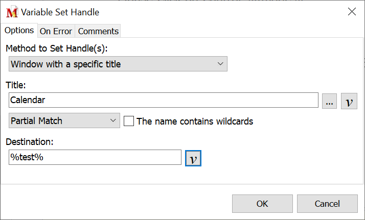 Select this option if a wildcard is included in the window title name. A wildcard uses the " * " or " ? " characters in the title to expand the possibilities of a match. These are similar to the wildcards used in Windows for searches.