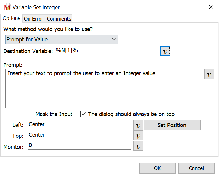This option saves the value of the active monitor (whichever monitor has focus) to an Integer variable. The values are similar to the monitor numbers mentioned above. The first monitor receives a value of 0 (zero). A second monitor receives a value of 1 (one), the third monitor 2 (two), and so on.