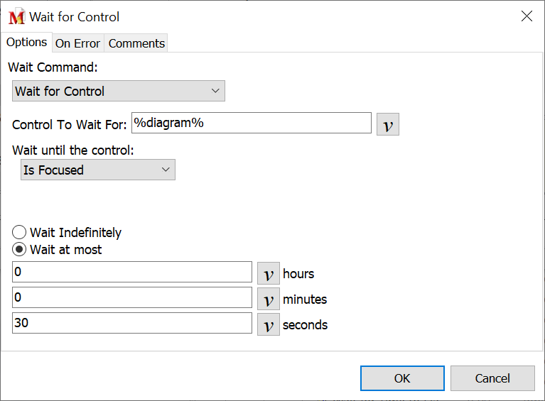With this option checked, the macro waits the number of hours, minutes and seconds specified for the Wait For action to occur. If that action does not take place within the specified time frame, the macro takes the action selected in the On Error tab.