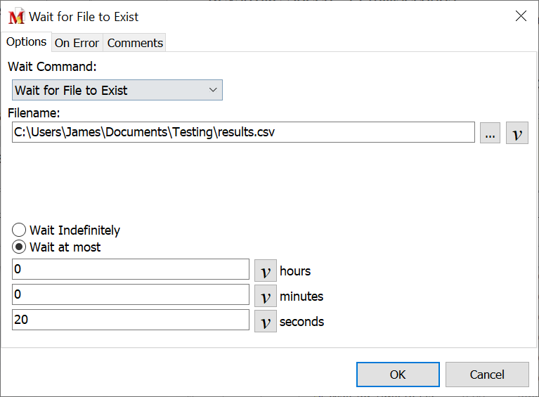 This option waits for a specific file to exist. As an example, a macro creates a new file and then uses the Wait for File to Exist command to instruct the macro to wait until the file has been created before continuing.