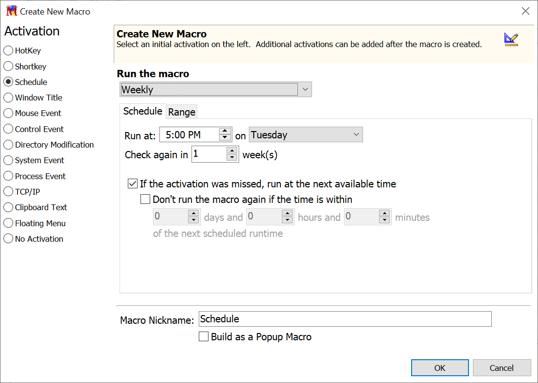 If the scheduled activation was missed, it may not be desirable to run the macro twice within a relatively short period of time. For example, insert a value of "2' in the days field. If the computer is restarted on Monday after being on vacation for a week and the macro is scheduled to run Tuesday, the skipped macro from the prior week does not run because the date is within 2 days of the next scheduled macro set for Tuesday.