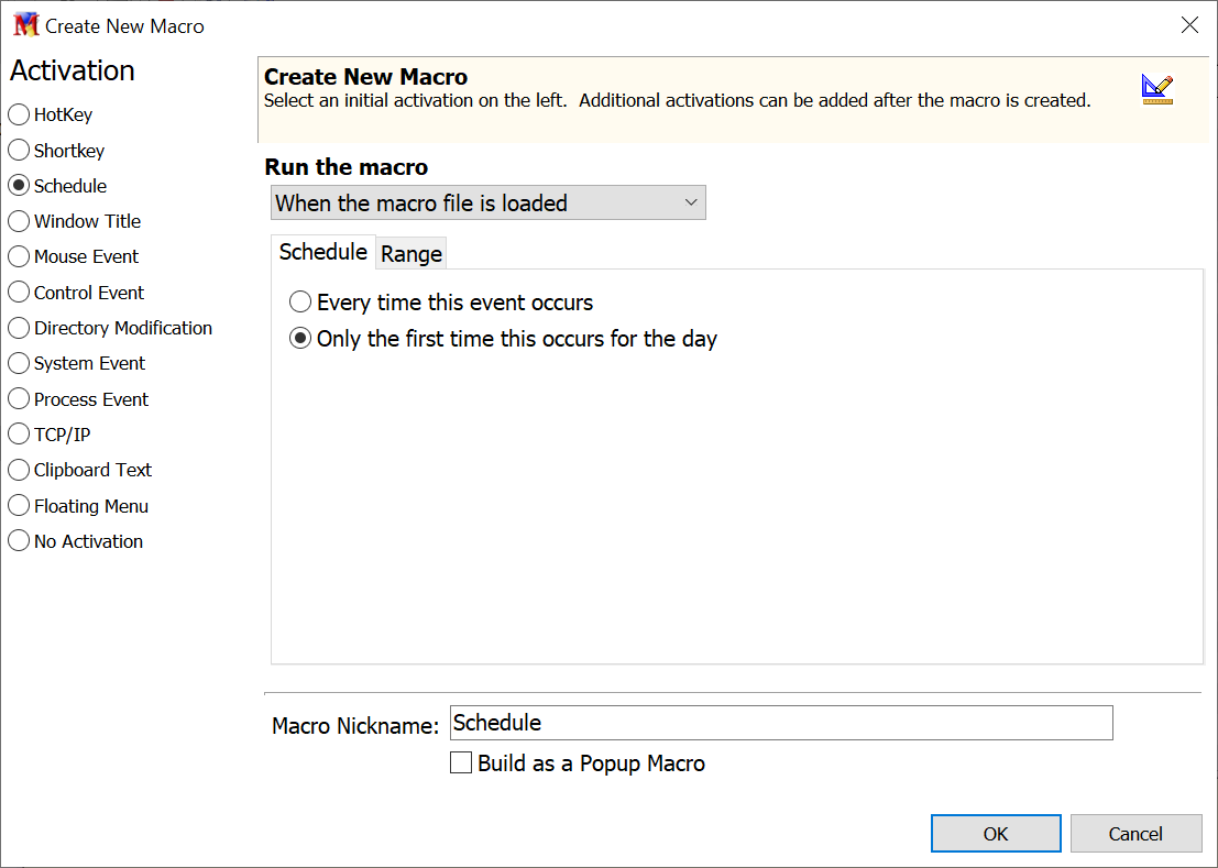 This is similar to the At Startup schedule with one difference. Any time that the macro file containing the scheduled macro is loaded, the macro runs. When Macro Express loads, the file opens and the macro plays back.