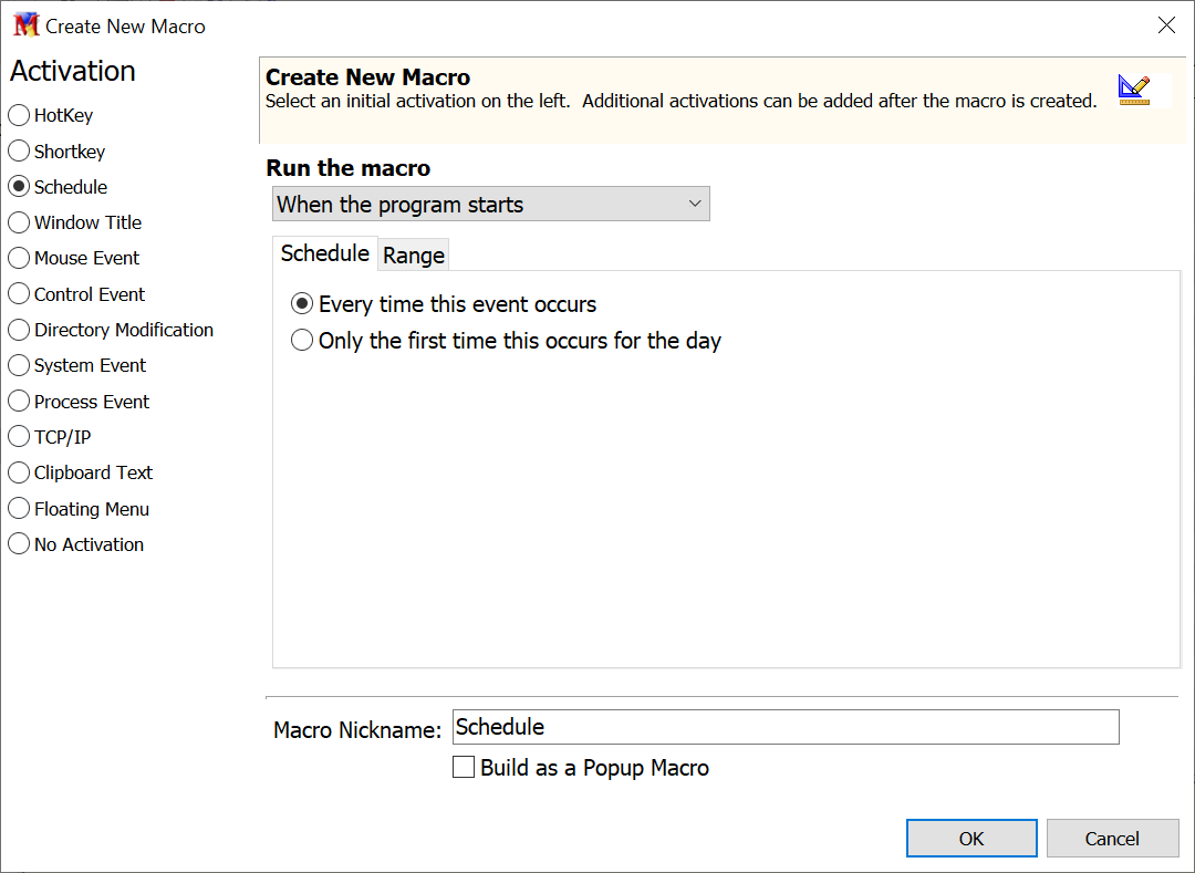 This option plays back the scheduled macro the first time Macro Express is started for the day. If the program is restarted, the macro does not play back.
