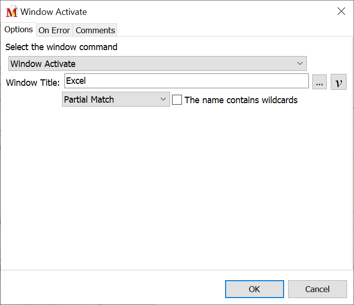 Select this option if a wildcard is included in the window title name. A wildcard uses the " * " or " ? " characters in the title to expand the possibilities of a match. These are similar to the wildcards used in Windows for searches.