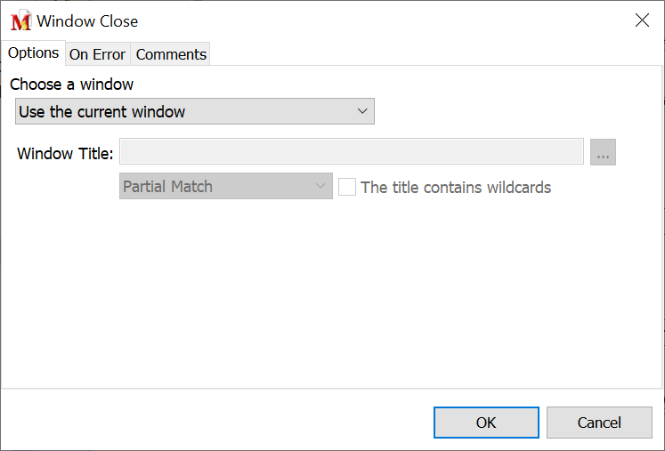 Select this option if a wildcard is included in the window title name. A wildcard uses the " * " or " ? " characters in the title to expand the possibilities of a match. These are similar to the wildcards used in Windows for searches.