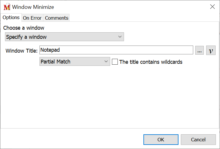 Select this option if a wildcard is included in the window title name. A wildcard uses the " * " or " ? " characters in the title to expand the possibilities of a match. These are similar to the wildcards used in Windows for searches.