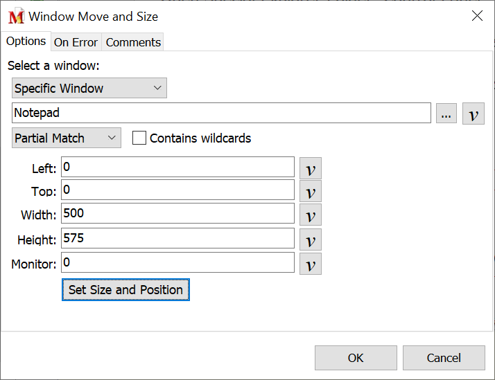 The Partial Match option does not require an exact window title match. For example, if resizing or moving a notepad window, inserting "notepad" or "notep" as the window title will find the window. This is particularly useful as some Window Titles change based on whether a given file is open. Case sensitivity is not required. For example, "NOTepad" will work as well as "notepad".